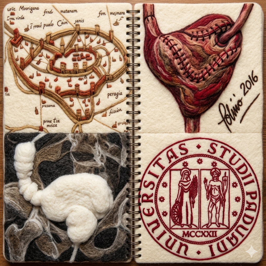 Dopo una cistectomia radicale robotica per Neoplasia Vescicale, è possibile (quando indicato) ricostruire la vescica con un segmento di intestino. Questa è la tecnica di ricostruzione che abbiamo ideato a Padova (con la stessa forma dell’antica città di Padova!).